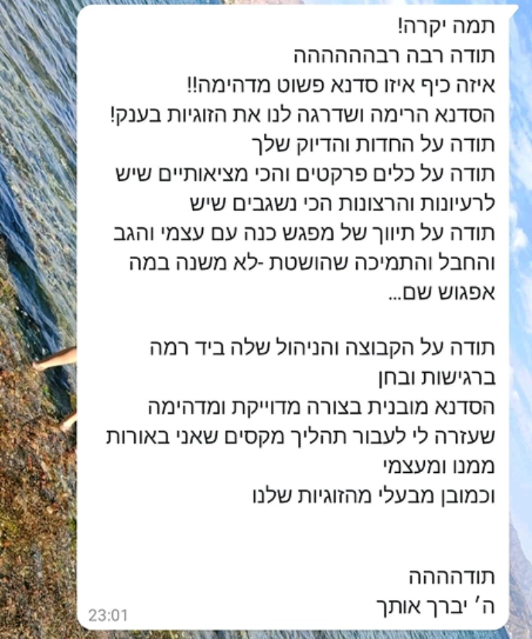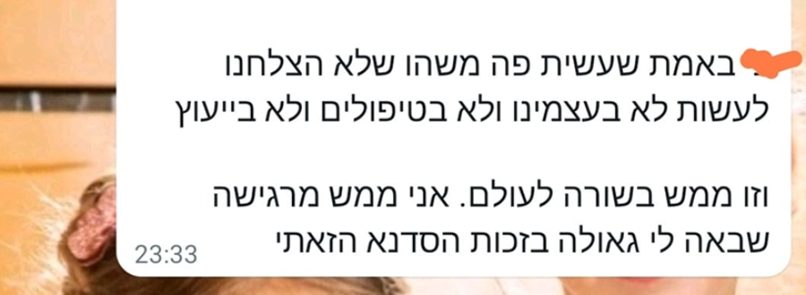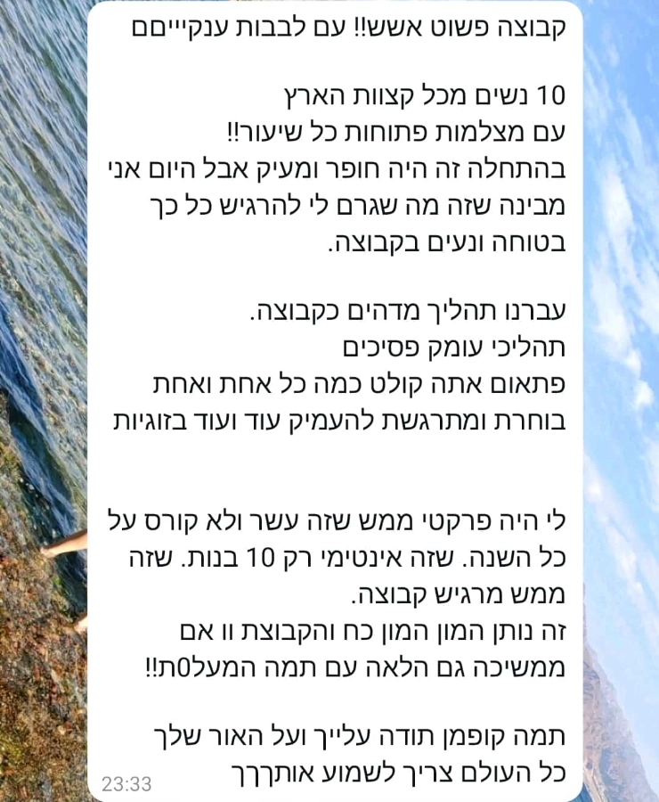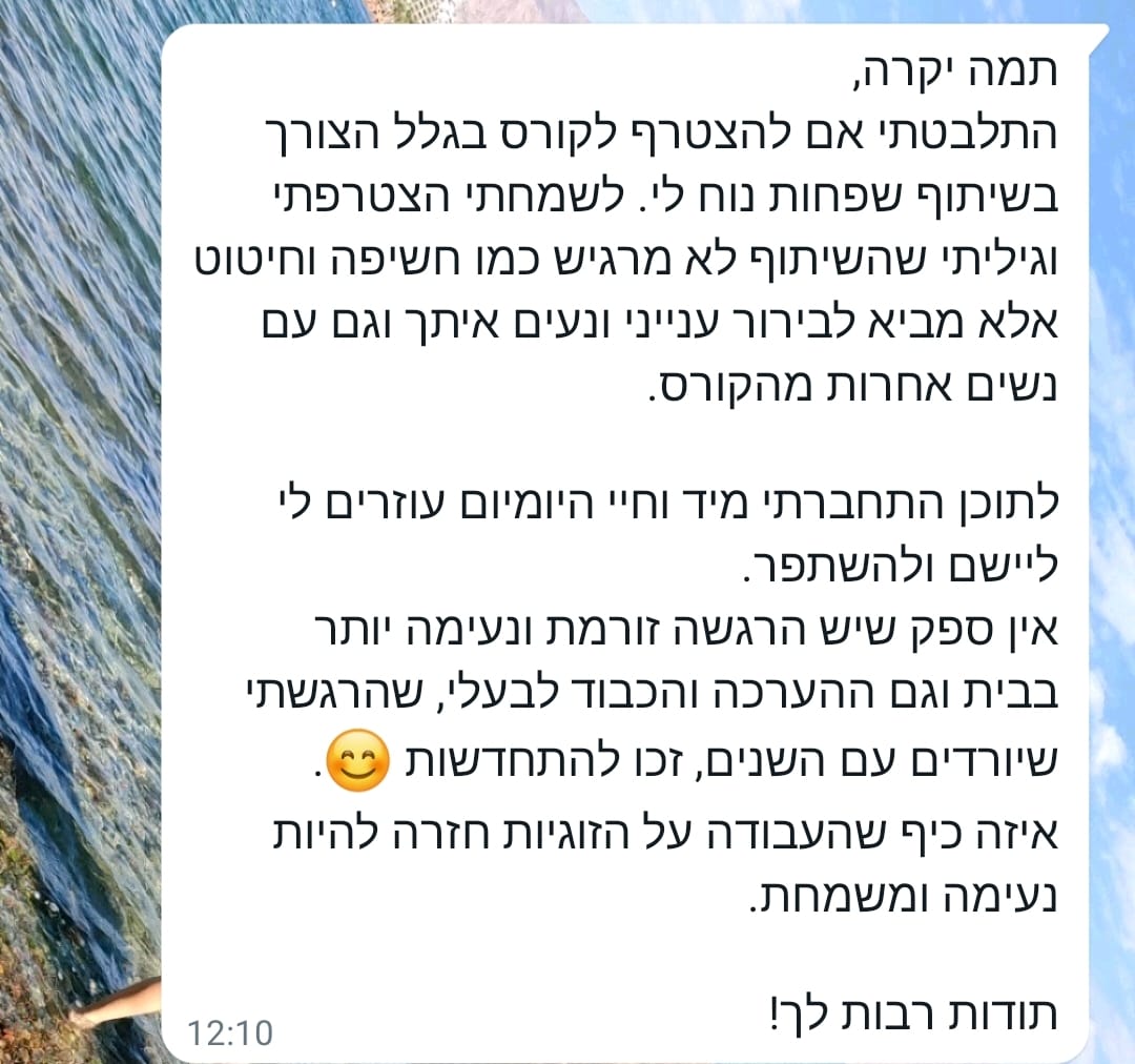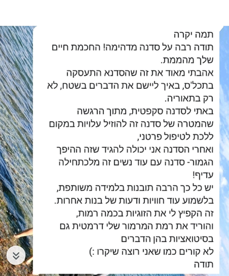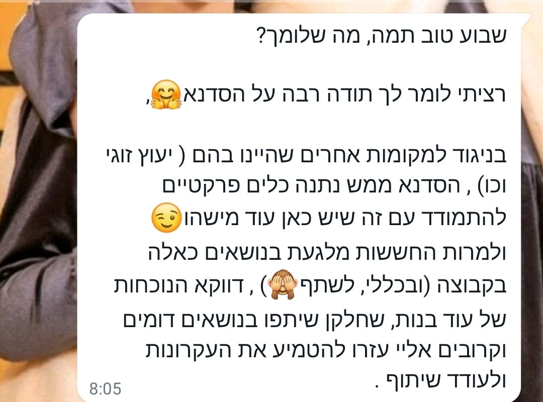 ושהן גילו להפתעתן שהיה בסדנה משהו שאיפשר פתיחות וכנות שלא יכלו לדמיין מראש, אפילו שזה היה בזום.