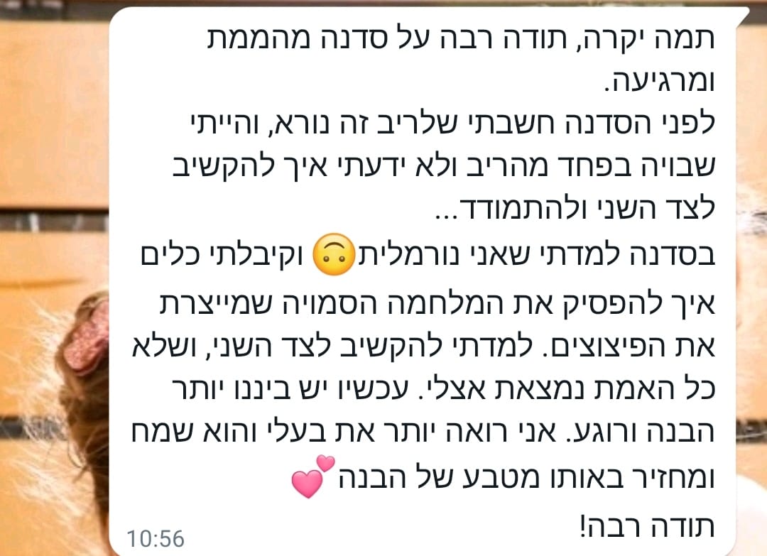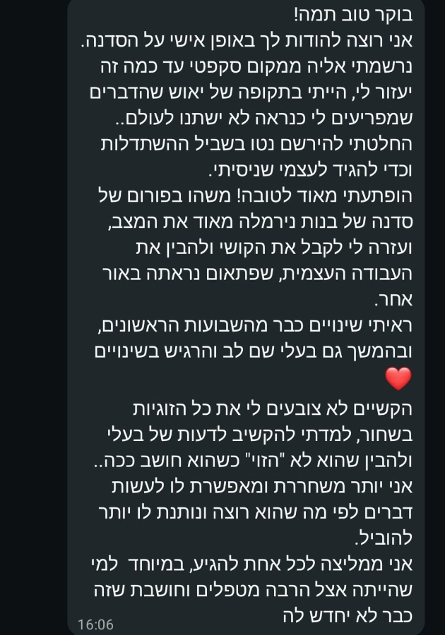 בסדנה אמנם אני מדברת ומסבירה את הגישה החדשה שלנו אבל כל אחת מעלה גם בעיות מהשטח ומקבלת מענה אישי וספציפי כך שכל התיאוריות הופכות לשינוי מעשי בבית ולא נשארות במחברת.
